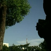 御苑の森をバックに